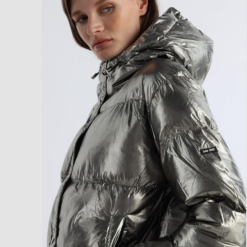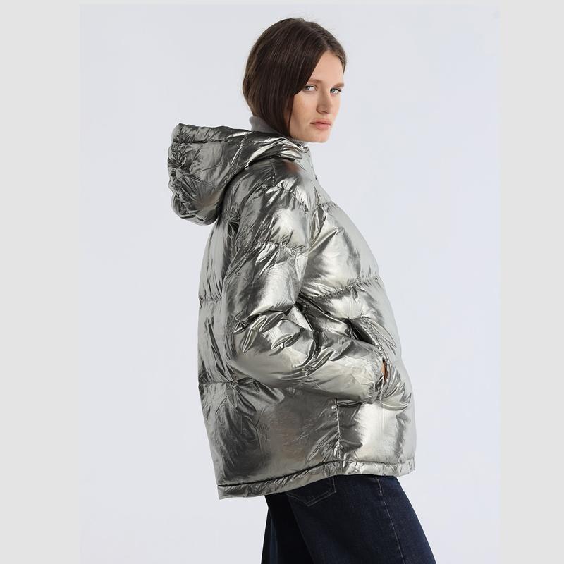 Para los dias de más frio. Abrigo puffer metalizado con capucha ajustable y bolsillos laterales.