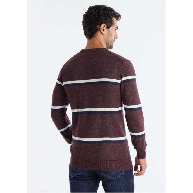 Color berenjena con franjas en blanco y azul marino.