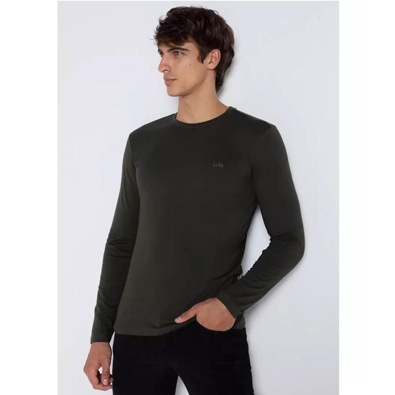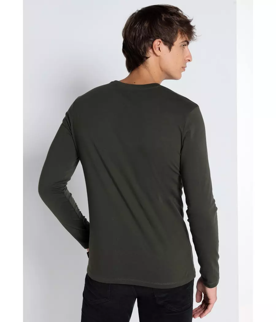 Camiseta de cuello redondo y manga larga color verde caza con pequeño logo de Lois bordado en el pecho.