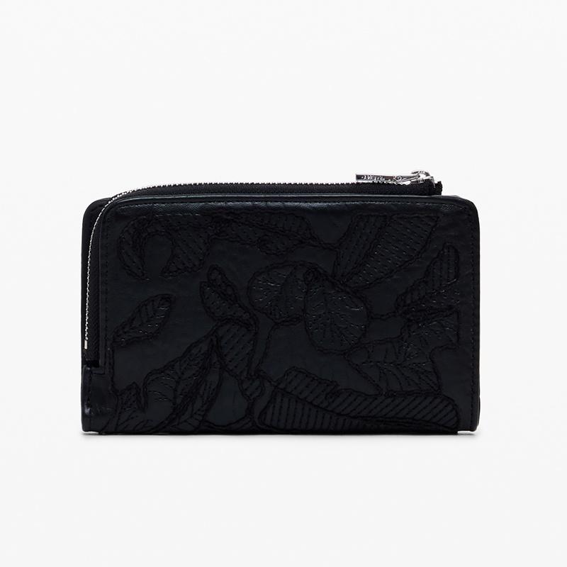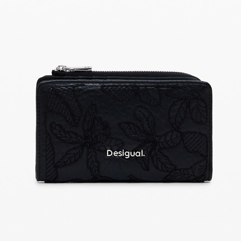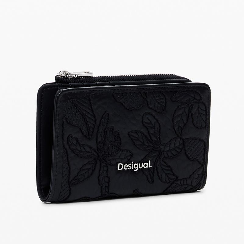 Monedero mediano en efecto piel, con bordados y logo en aplique metálico de color liso.