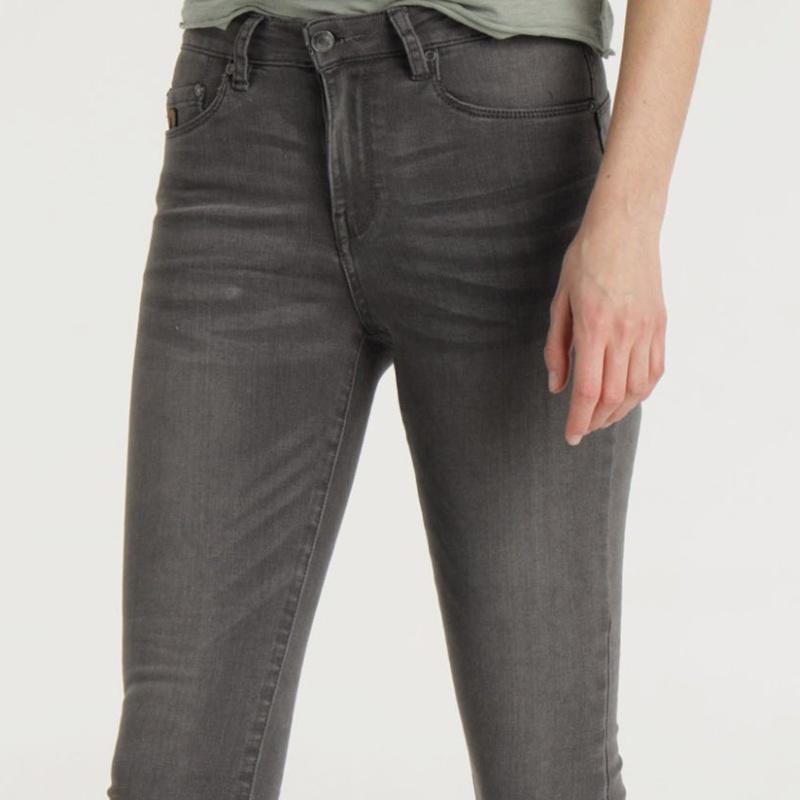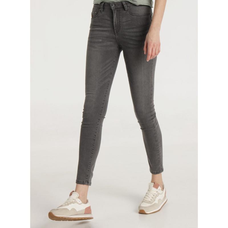 Tejido denim elástico en color gris medio con suaves desgastes. Cómodo, duradero.
