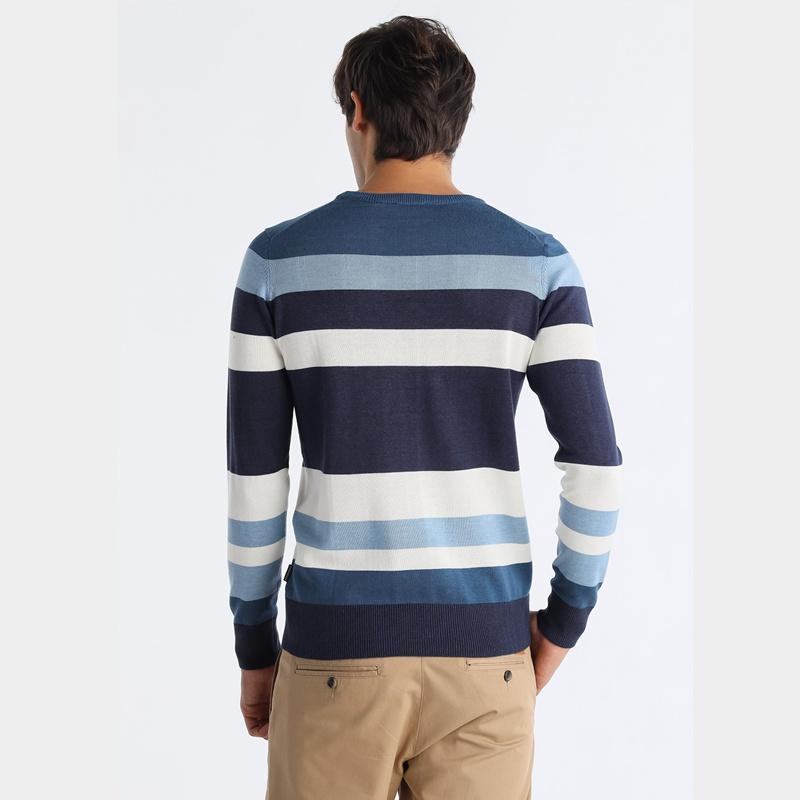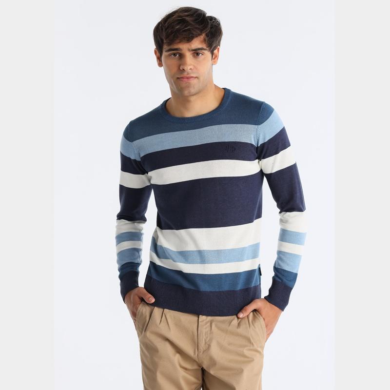 Jersey de cuello caja con diseño de franjas combinando azules y hueso.