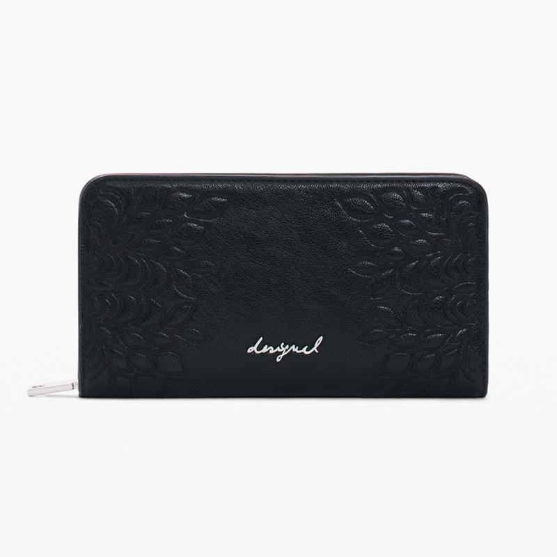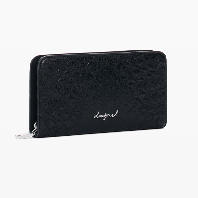 Monedero mediano con bordado de hojas en tejido efecto piel y múltiples compartimentos.