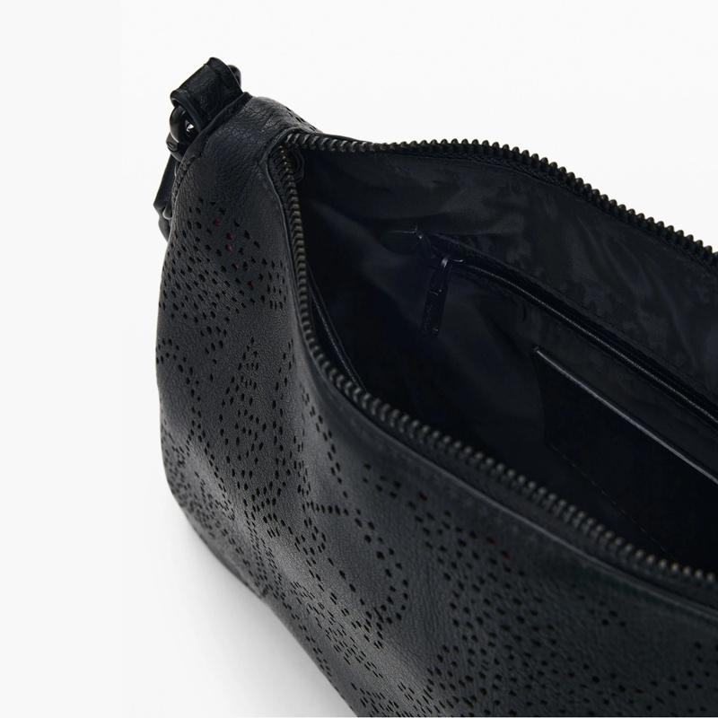 Bolso mediano de efecto piel, en color liso, con estampado troquelado de flores y correa extensible.