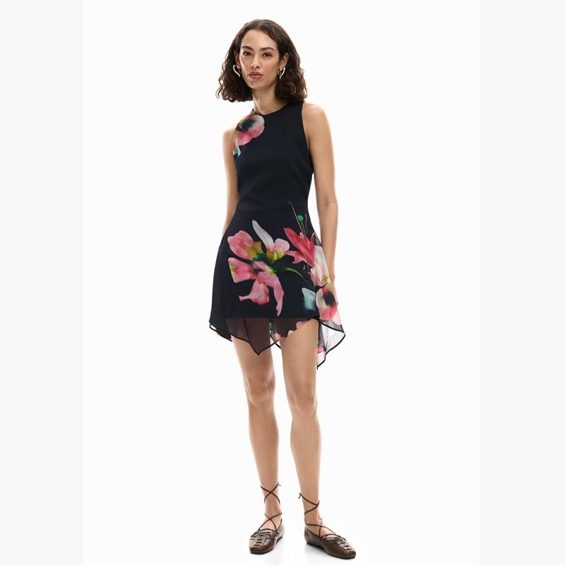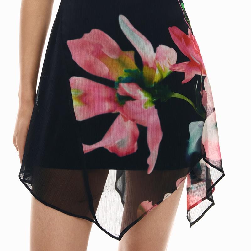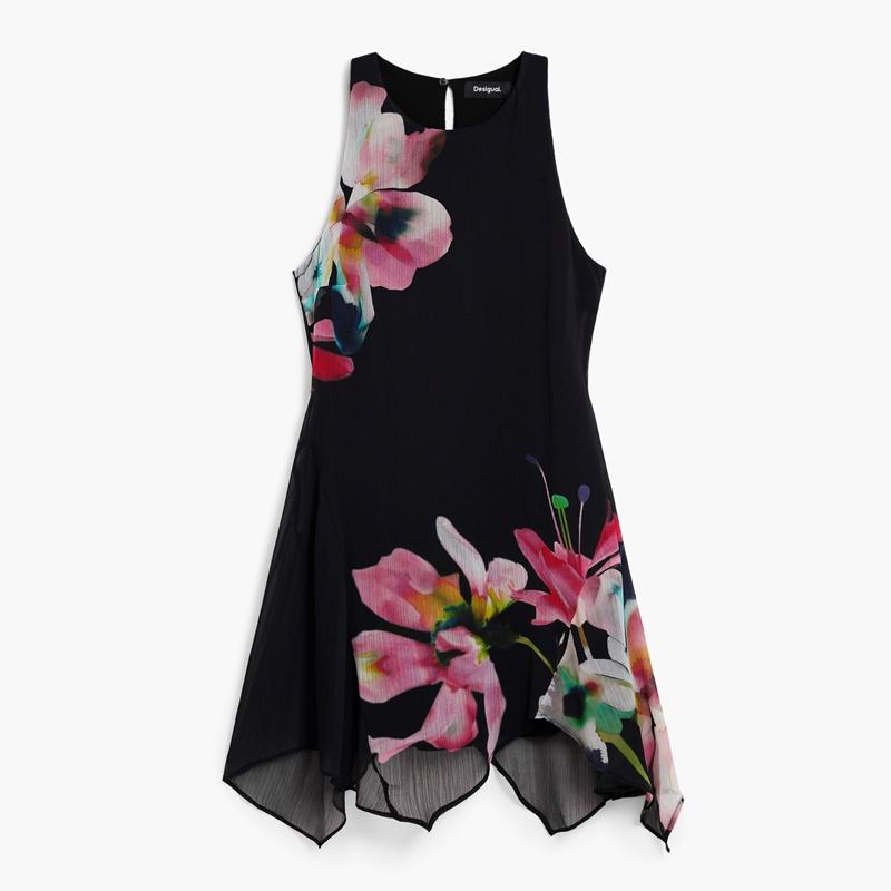Vestido sin mangas, confeccionado en tejido de tul, con bajo asimétrico y estampado de flores con fondo negro.