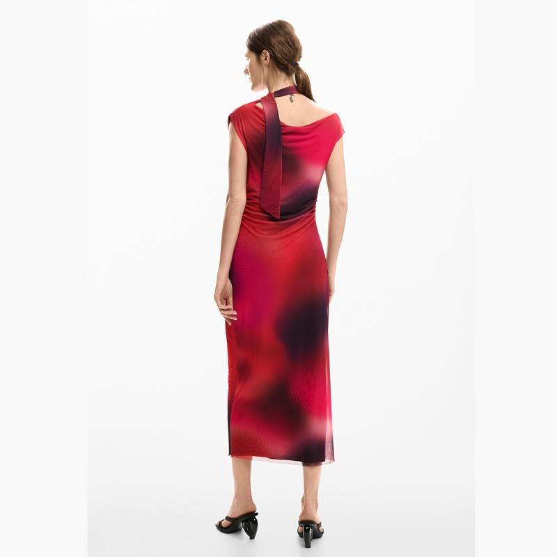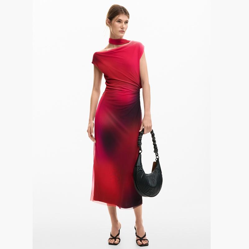Vestido de corte midi en gasa, con drapeados laterales, sin mangas, escote asimétrico y estampado de manchas de colores.