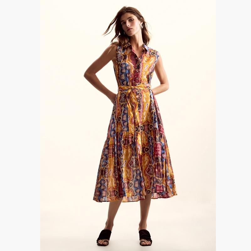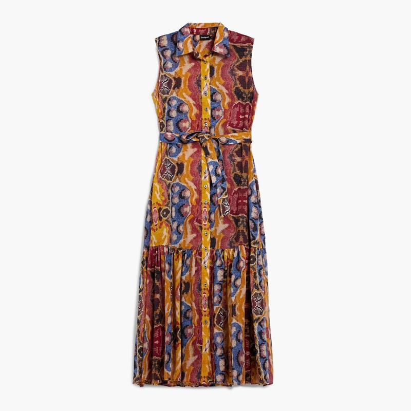 Vestido largo sin mangas, de estilo camisero con cinturón y con estampado de estilo étnico diseñado por Mr. Christian Lacroix.