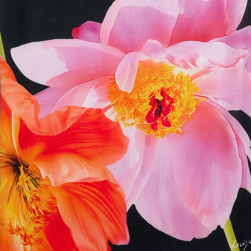 Foulard rectangular con estampado de grandes lirios de colores vivos sobre fondo negro.