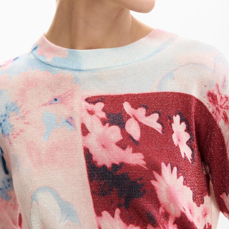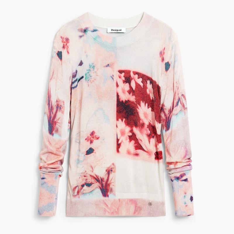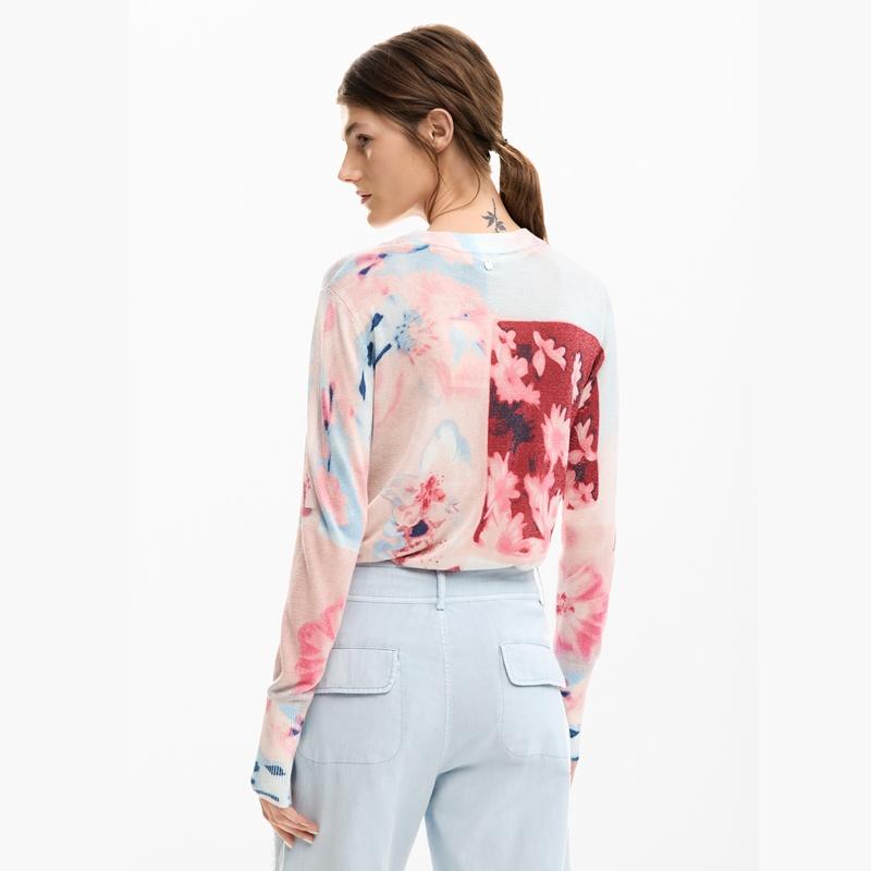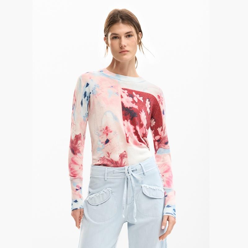 Jersey de punto fino con estampado que combina bloques de color en tonos rosa, azul y burdeos. Cuello redondo y manga larga con acabado recto en el bajo.
