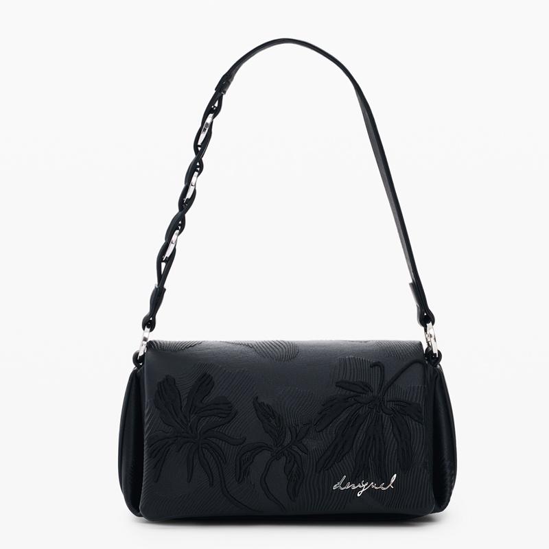 Bolso pequeño con solapa y flores bordadas en relieve en el mismo tono, correas intercambiables y charms extraíbles con cuentas de colores y tiras efecto piel.