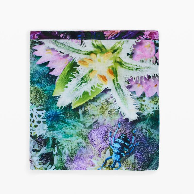 Foulard de forma rectangular, en tejido vaporoso y con estampado de flores inspirado en un jardín.