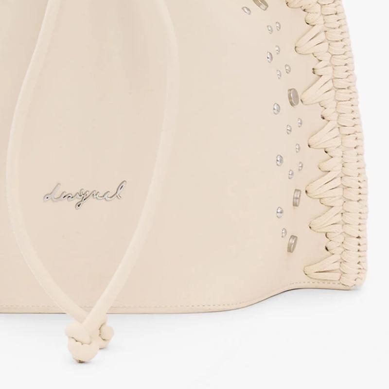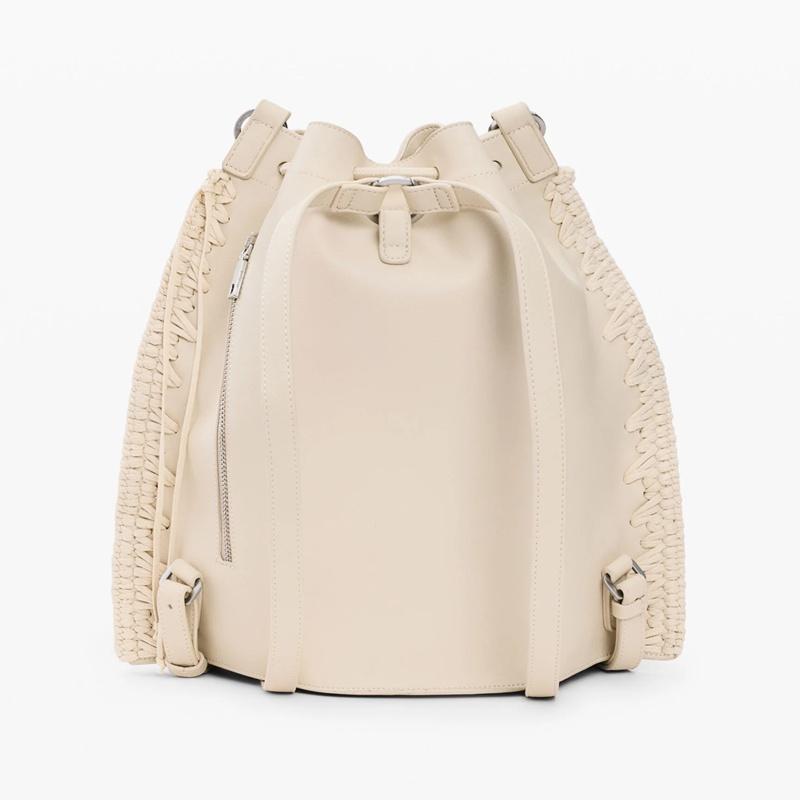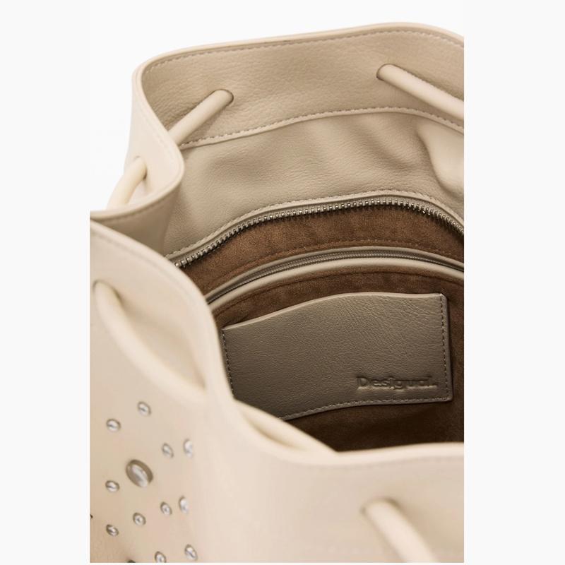 Mochila mediana de piel sintética en color crudo con bordados decorativos en los laterales y cierre superior con cordón ajustable y cremallera.. Diseño con asa larga para hombro y detalles metálicos visibles en tiradores y refuerzos.