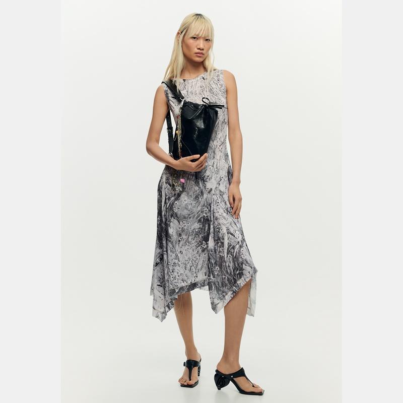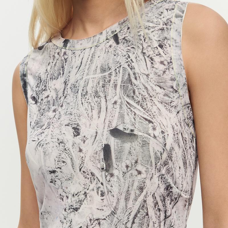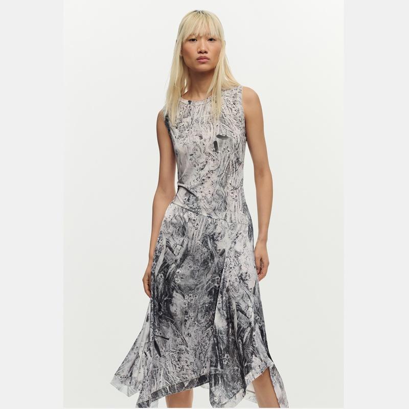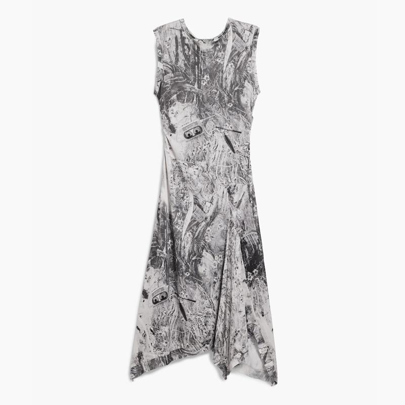Vestido sin mangas de corte evasé, drapeado en la cintura, bajo asimétrico y estampado de estilo fotográfico.