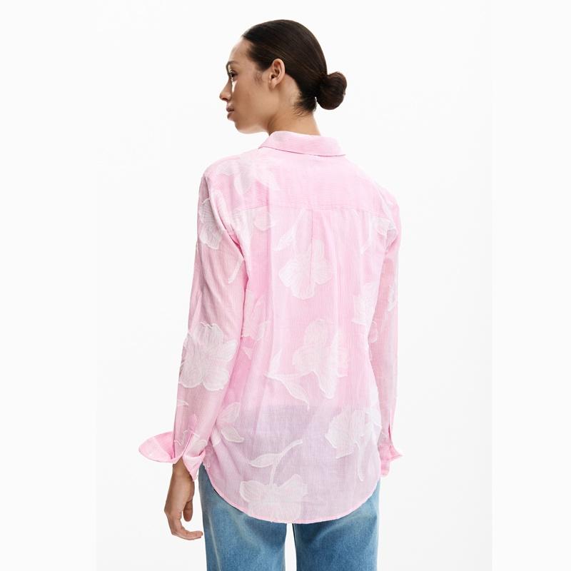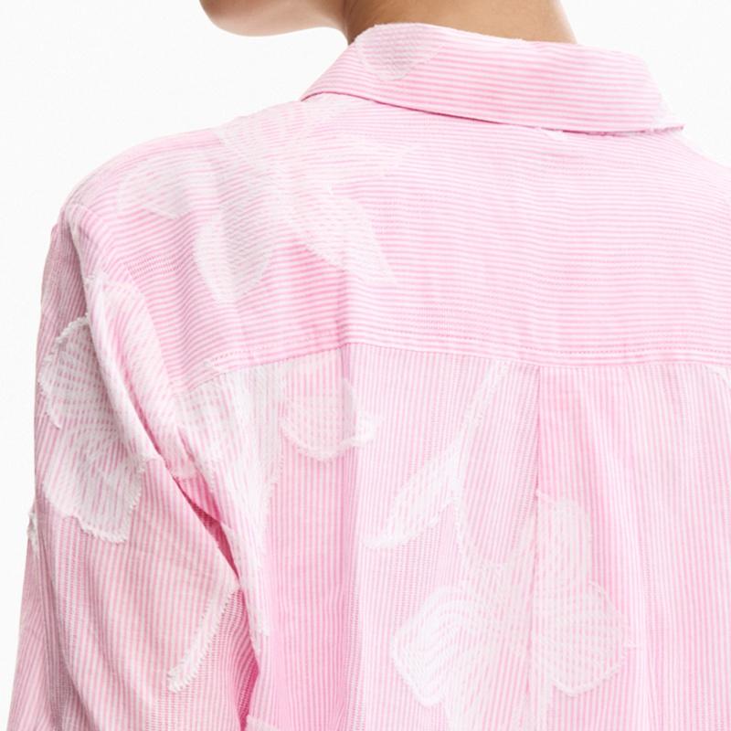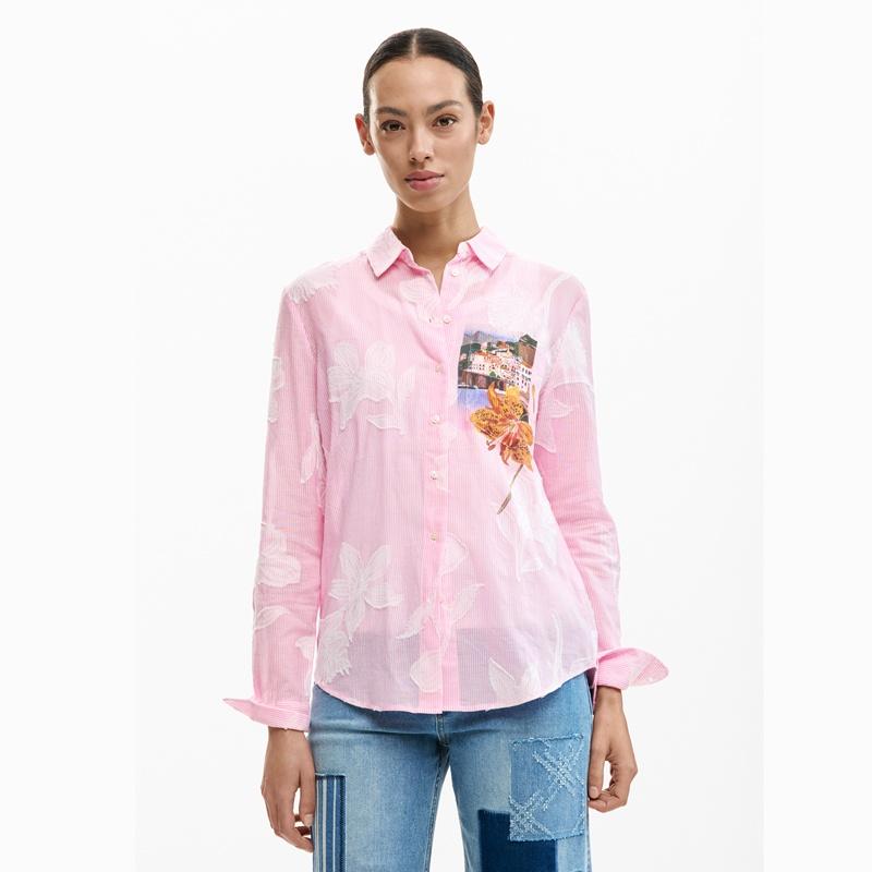 Camisa de manga larga con estampado de rayas y flores y detalle de postal con paisaje en el pecho.