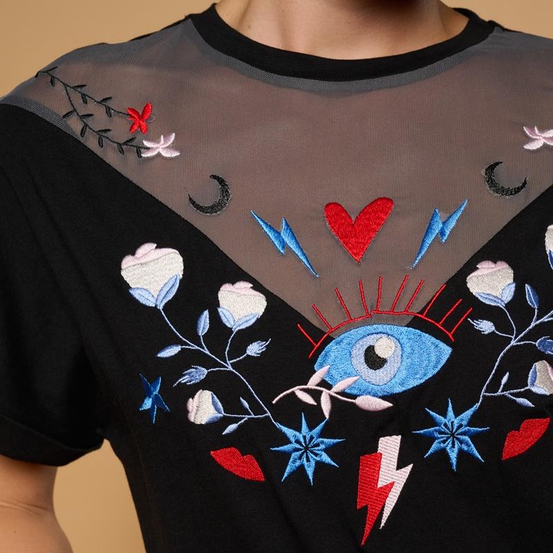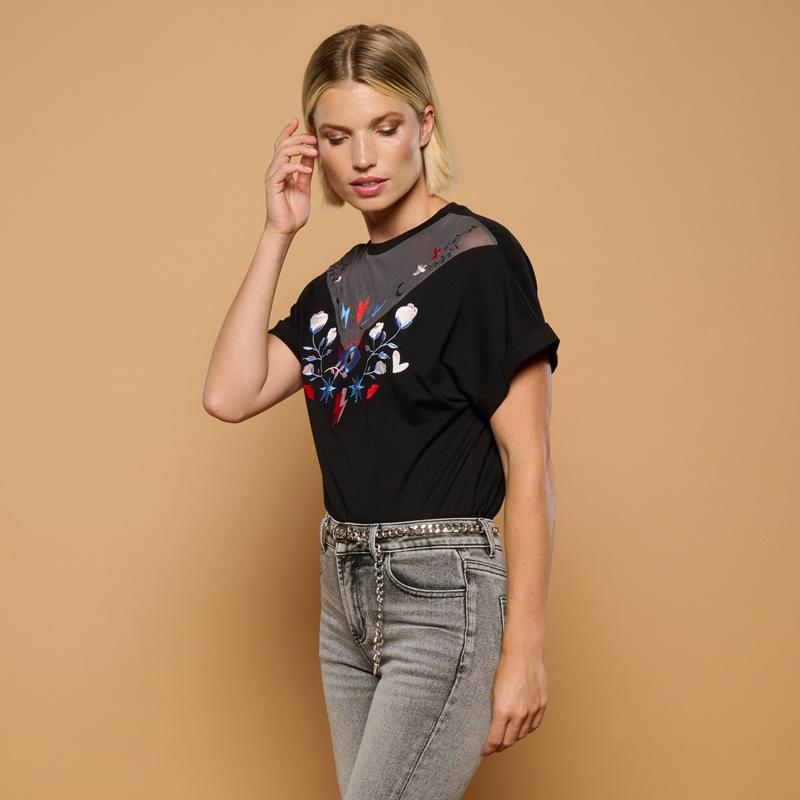 Camiseta negra con escote en tejido semitransparente y bordados en la parte delantera.